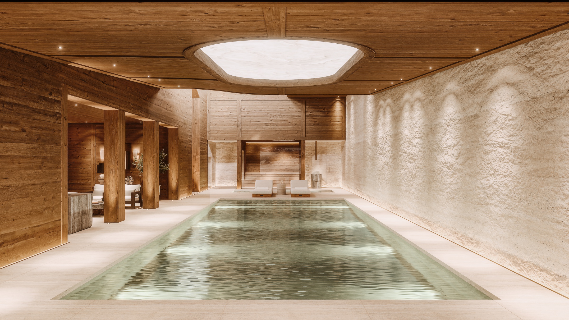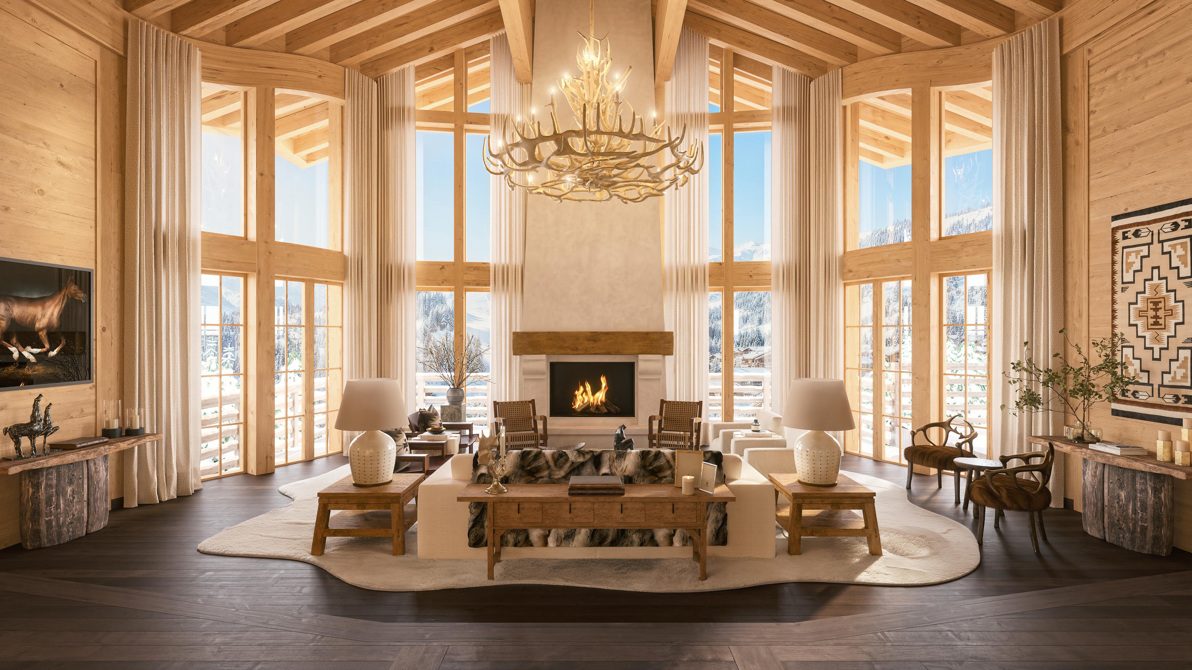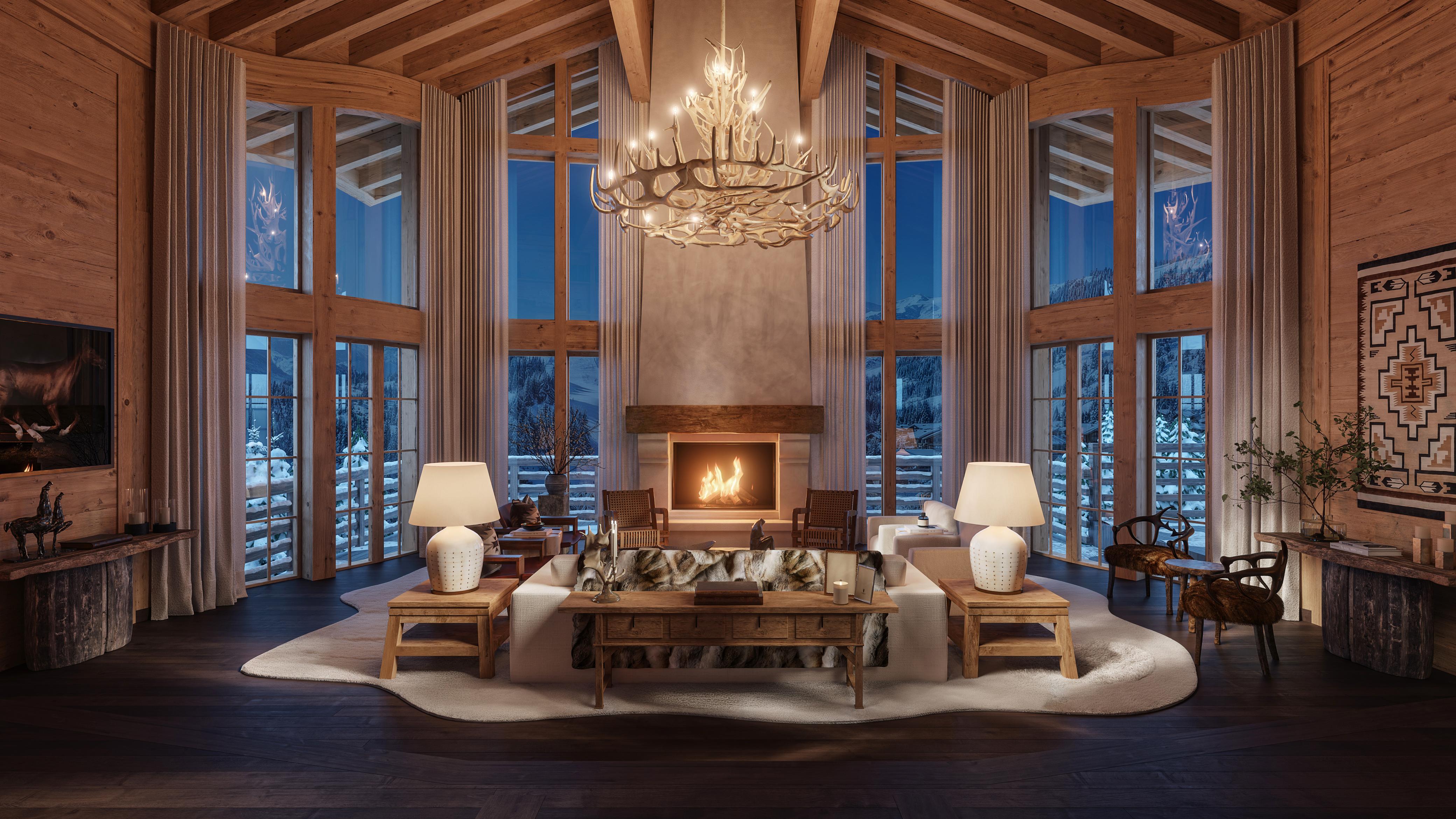 A cozy and elegant mountain chalet blends warmth and sophistication, featuring rich natural materials like exposed wood beams, stone fireplaces, and plush furnishings. Large windows frame breathtaking mountain views, while soft lighting and layered textures create an inviting ambiance. Thoughtful design balances rustic charm with refined comfort, offering a serene retreat where luxury meets nature.